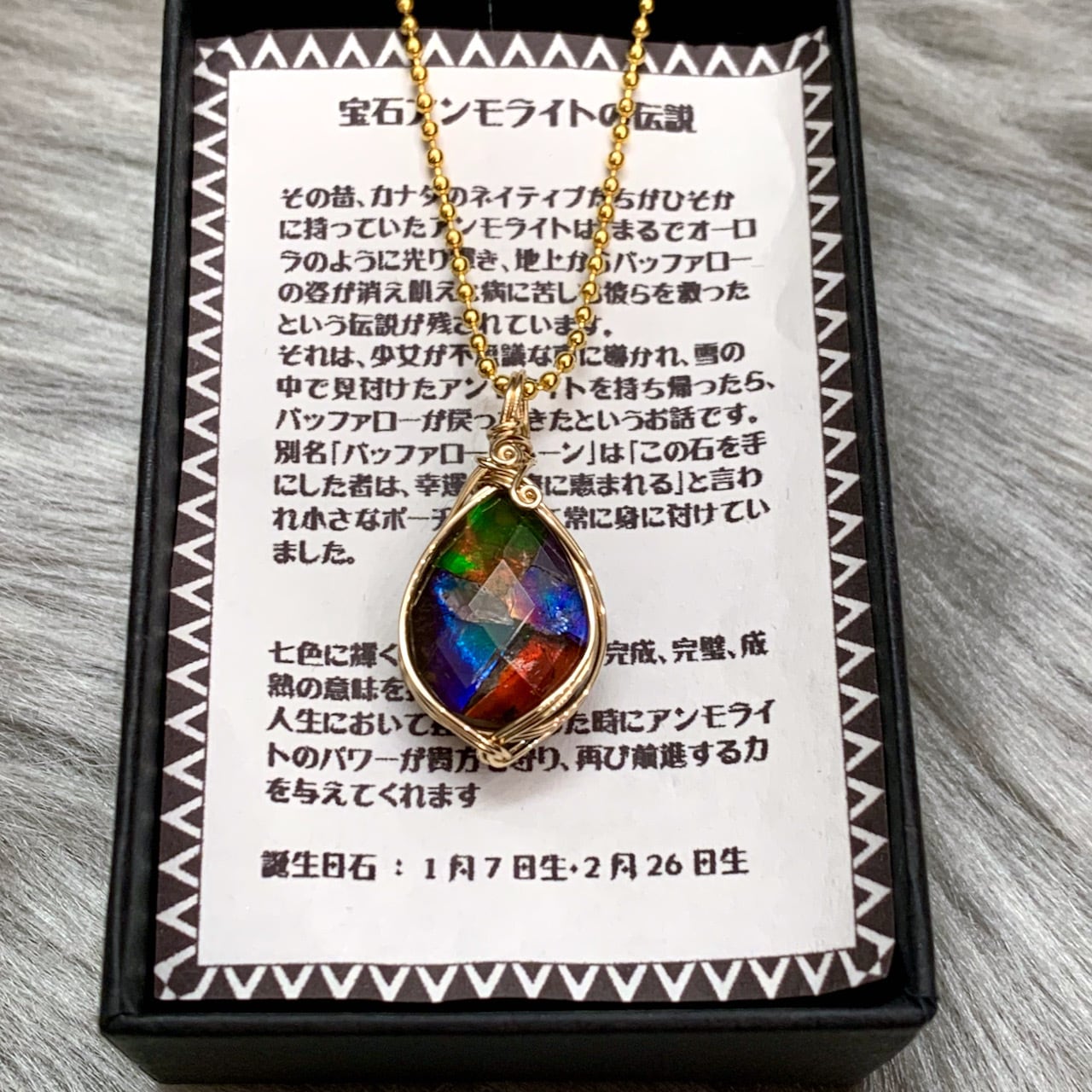 アンモライトはアンモナイトの化石が悠久の年月をかけて、虹色の輝きを得た奇跡の宝石で、カナダ・アルバータ州の南部でしか採れません。